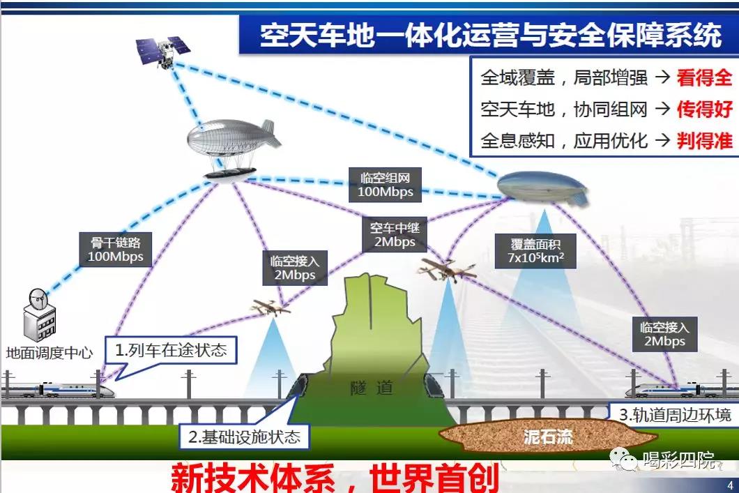 項(xiàng)目通過引入飛艇、無人機(jī)、列車及地面軌旁系統(tǒng)組成互聯(lián)互通的專用網(wǎng)絡(luò),有效整合網(wǎng)絡(luò)系統(tǒng)中空間和地面兩個部分,通過專用網(wǎng)絡(luò)將原本分散的感知監(jiān)測能力連接成一體。通過空天車地綜合組網(wǎng),實(shí)現(xiàn)對軌道交通廣域線路、基礎(chǔ)設(shè)施、在途列車群狀態(tài)的立體信息獲取(看得全)、可信傳輸(傳得好)與精準(zhǔn)運(yùn)管(判得準(zhǔn)),從而滿足未來軌道交通系統(tǒng)全息化安全保障和運(yùn)營支持的需求。